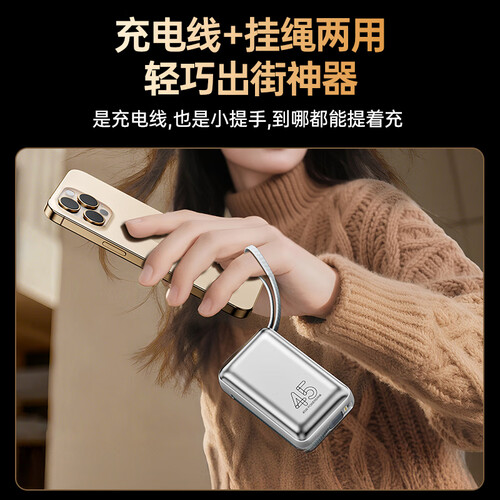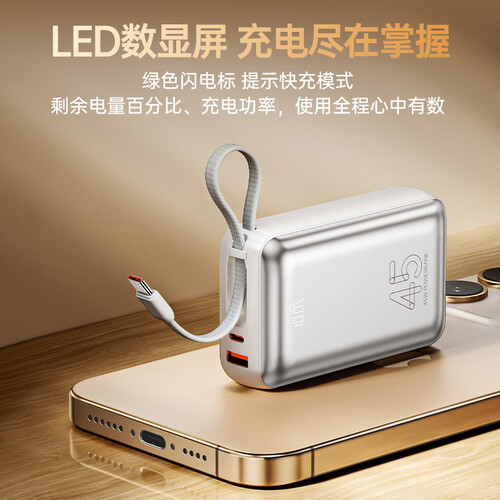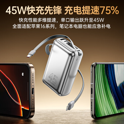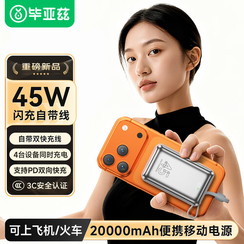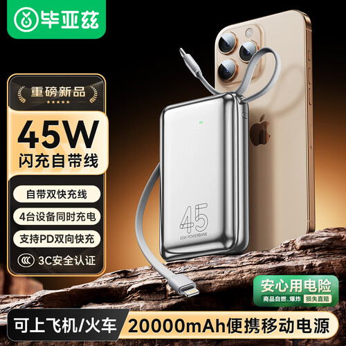 毕亚兹【3C认证可上飞机】充电宝20000毫安45W大功率快充自带线移动电源适用苹果17华为小米手机YD76-20