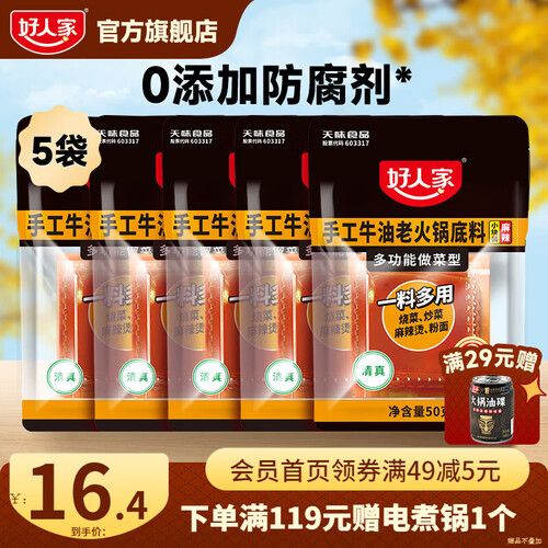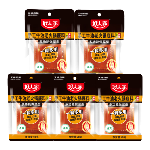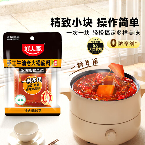 - 好人家0添加香辣牛油火锅底料煮火锅冒菜麻辣烫小块分装露营便携调料 手工火锅50g*5【多用途火锅料】