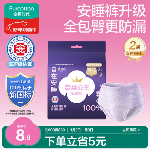 - 全棉时代奈丝公主医护级纯棉安心裤安睡裤裤型卫生巾ML 2条旅行装京东自营
