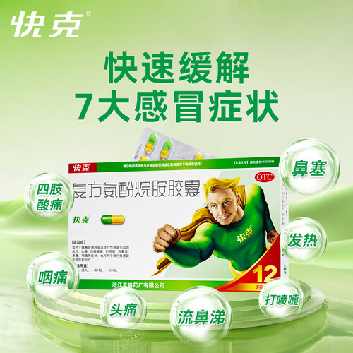 - 快克 复方氨酚烷胺胶囊12粒 流感药 感冒咳嗽 头痛发热 鼻塞流涕打喷嚏 咽痛 抗病毒用药 家庭常备药