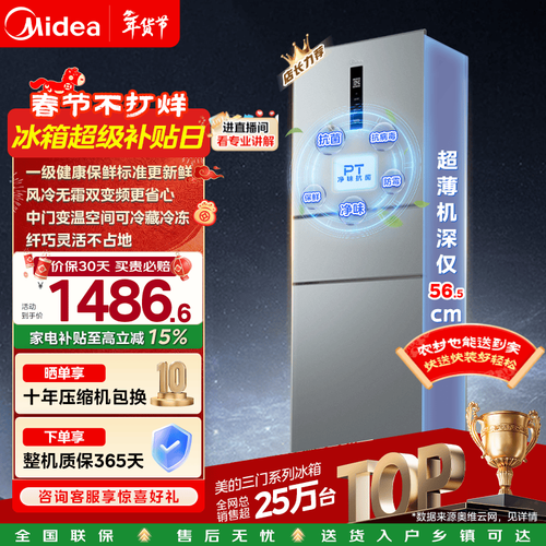 - 美的(Midea)249三开门多门双变频一级能效风冷无霜中门变温大冷冻空间节能低噪租房小型家用小冰箱政府补贴 MR-249WTPE