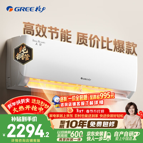 - 格力出品 晶弘空调 小凉神 大1匹 新一级能效变频 纯铜管卧室省电挂机 国家补贴KFR-26GW/JHFNhAa1Bj