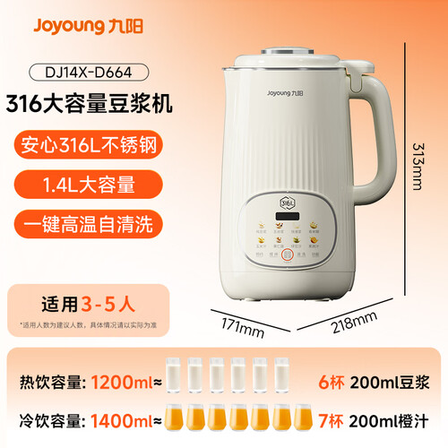 - 九阳25年新款1.4L大容量豆浆机316L不锈钢轻音免滤自清洗可预约家用全自动破壁机榨汁机DJ14X-D664