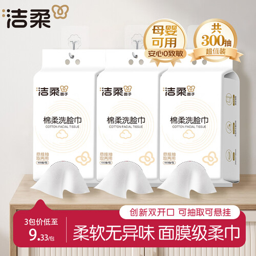 - 洁柔婴儿一次性洗脸巾宝宝擦脸巾面膜柔巾干湿两用加大加厚平纹洗面巾 100抽*3包【悬挂抽取两用】