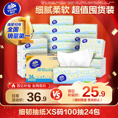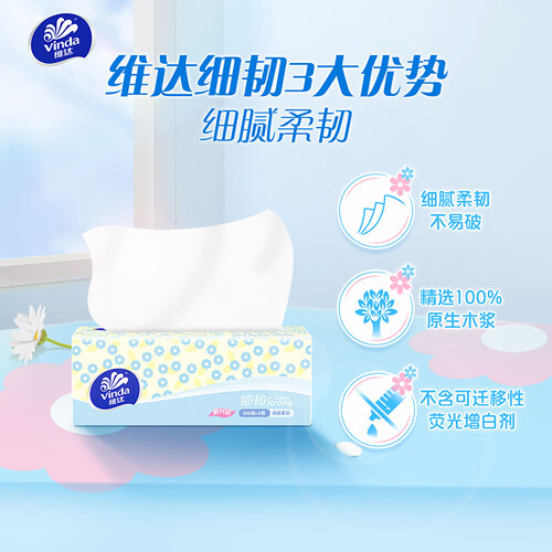 - 维达(Vinda)抽纸3层100抽 软抽面巾纸擦手纸 餐巾纸抽卫生纸 湿水不易破 细韧 3层 100抽*24包