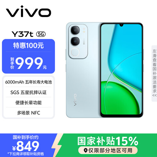 vivo Y37t 8GB+256GB 琉璃青 6000mAh五年长寿大电池 SGS五星抗摔认证 长辈功能 5G手机