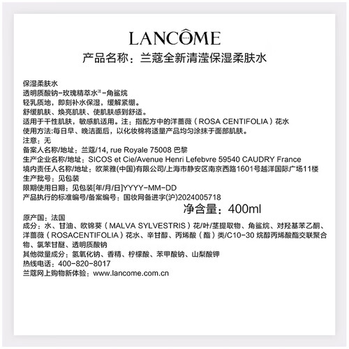 - 兰蔻 全新清滢保湿粉水柔肤水 400ml 新版大粉水 温和补水保湿