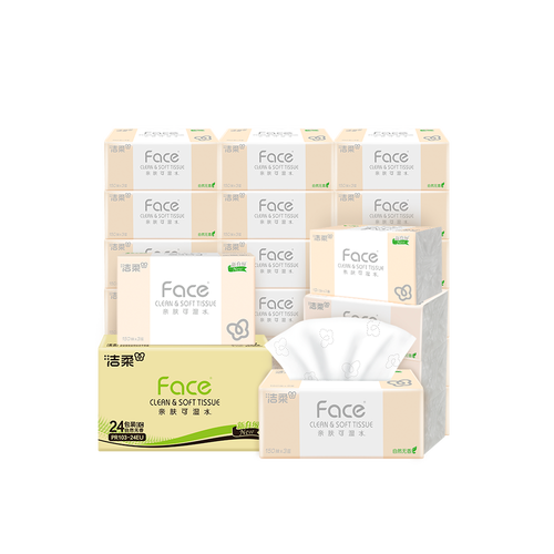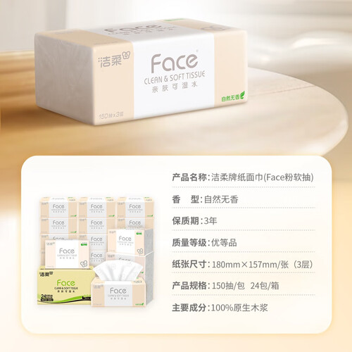 - 洁柔抽纸 粉face柔韧3层150抽*24包纸巾 可湿水面巾纸M码 整箱卫生纸