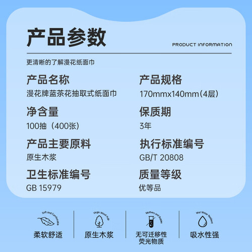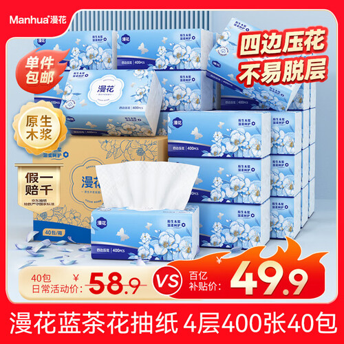 - 漫花蓝茶花纸巾抽纸4层400张*40大包整箱批发家用餐巾面巾卫生纸