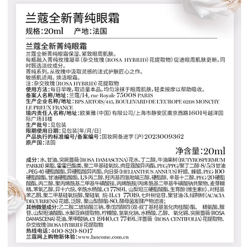 - 兰蔻全新菁纯眼霜20ml 紧致饱满保湿柔润年轻眼霜