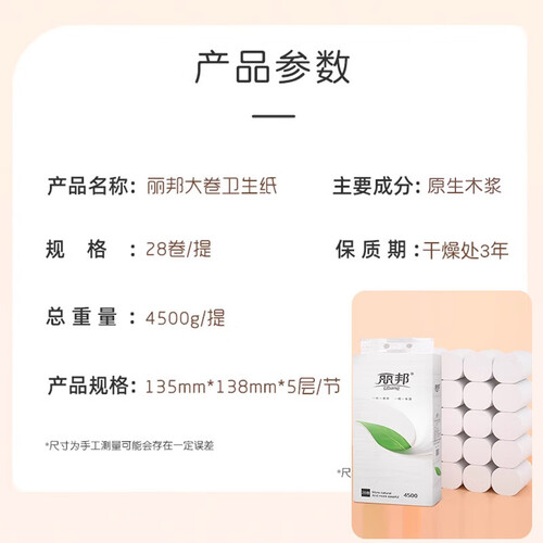 - 丽邦(Libang)妇婴卷纸一叶子系列五层加厚实惠卫生纸家用厕纸无芯卷纸 5层 160g/卷*28卷 【9斤】